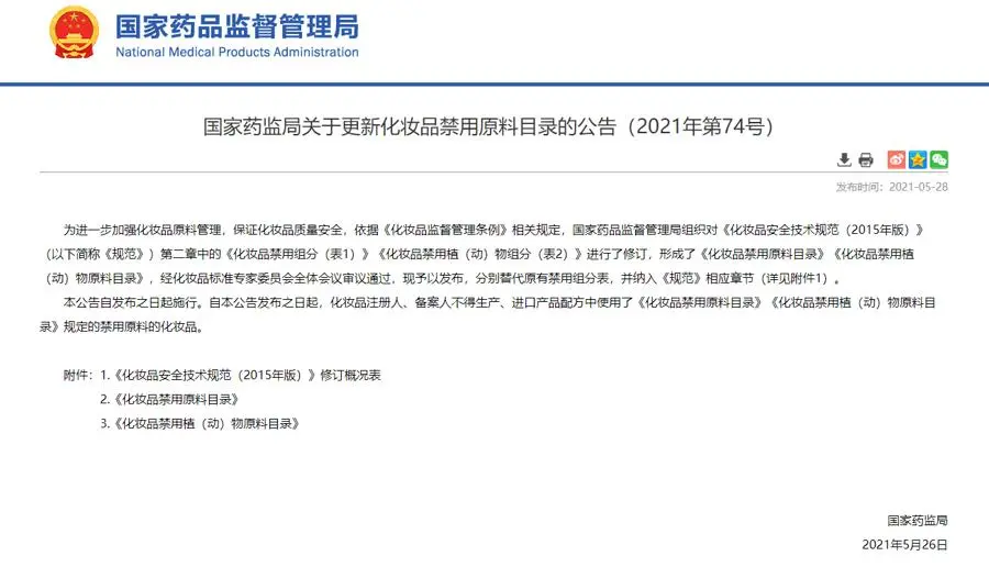 2021年5月26日,国家药品监督管理局发布《关于更新化妆品禁用原料目录的公告》,将“圆叶牵牛提取物”列入禁用目录。此前,“圆叶牵牛提取物”并不禁用,是化妆品可用的原料。百雀羚涉及该原料的个别产品在禁用期前添加了“圆叶牵牛提取物”,并不违反规定。