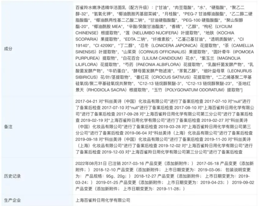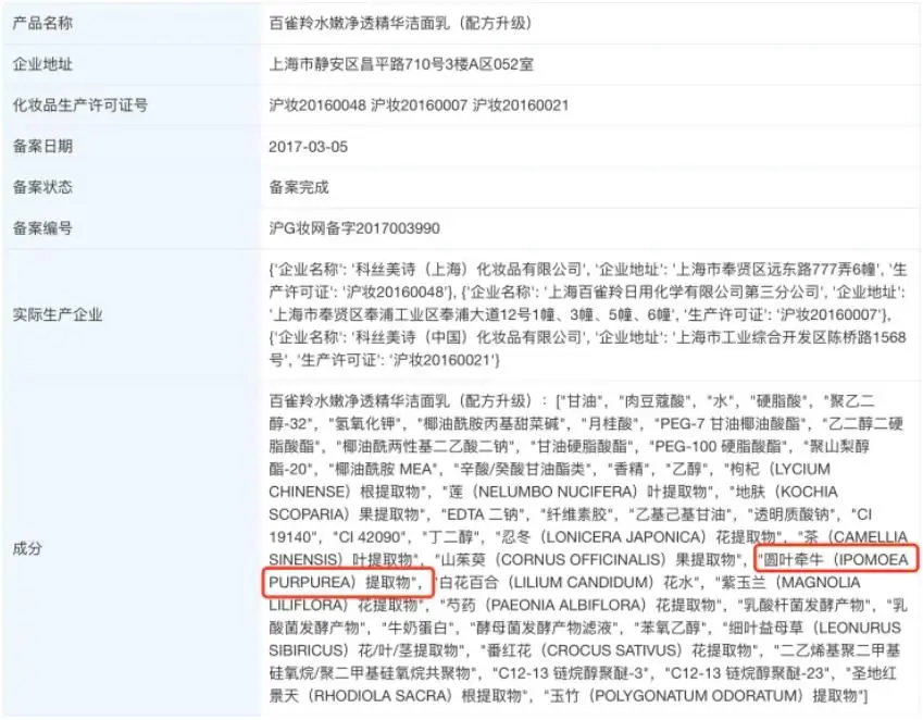 查看百雀羚的国产非特殊用途化妆品备案信息,可以注意到,该公司于2017年3月5日备案的沪G妆网备字2017003990号“百雀羚水嫩净透精华洁面乳”最后一次涉及“圆叶牵牛提取物”成分。2021年4月25日备案的“百雀羚水嫩净透精华洁面乳”已无“圆叶牵牛提取物”成分。