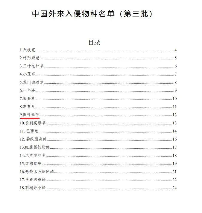 圆叶牵牛原产南美洲,别名牵牛花、喇叭花、紫花牵牛,目前世界各地广泛栽培和归化,1890年中国已引种栽培,已被列入中国外来入侵物种名单(第三批)。其入侵危害为,作为旱田、果园及苗圃杂草,可缠绕和覆盖其他植物,导致后者生长不良。
