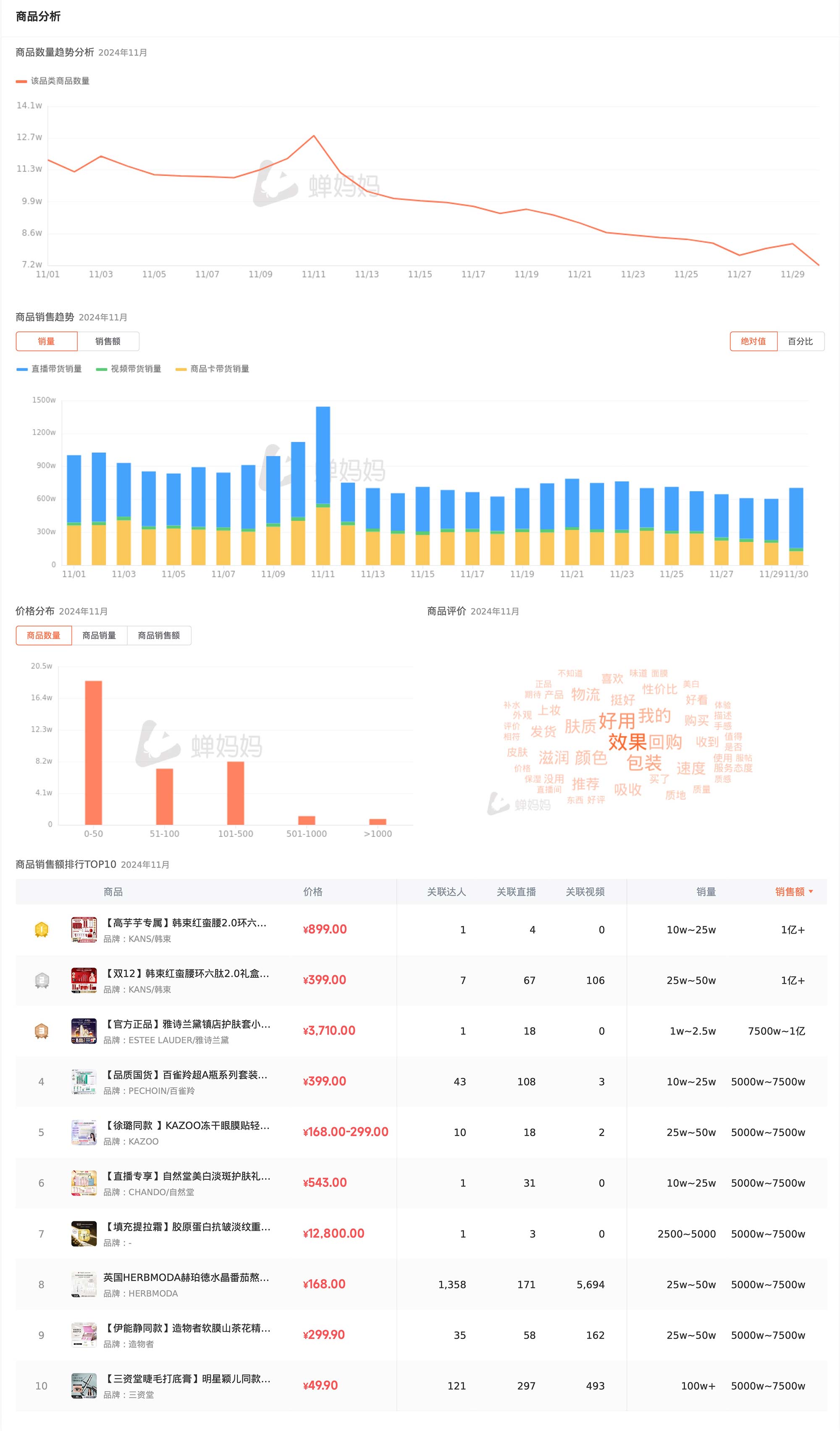 在商品层面,我们可以看到,从商品数量到销售趋势,再到价格分布和商品评价,每一个维度都呈现出市场的活跃度和消费者的购买热情。特别是在商品销售额排行中,KANS/韩束品牌以其卓越的表现,占据了多个席位。