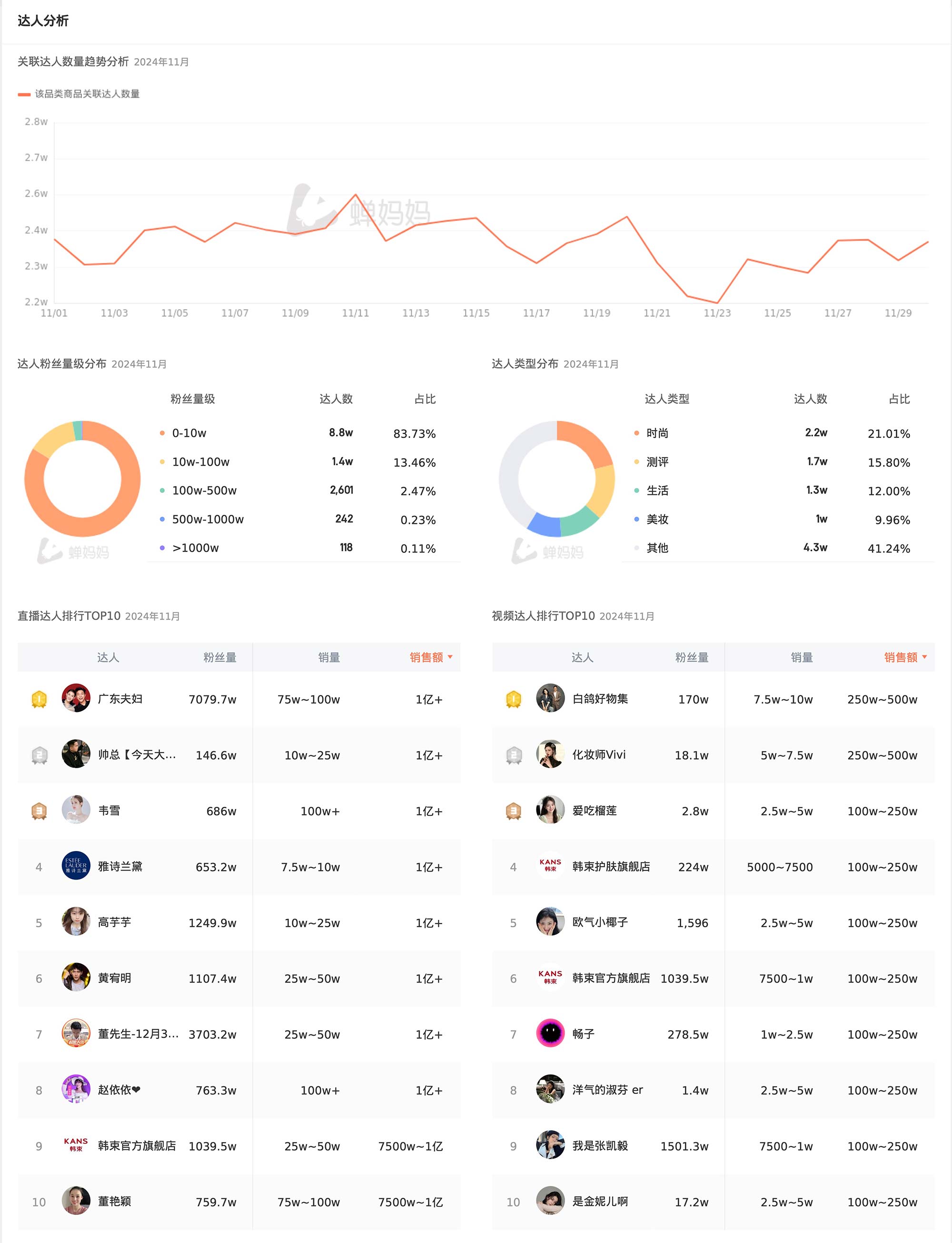 达人分析部分,我们看到了达人数量的增长趋势,以及粉丝量级分布和类型分布。这些数据不仅揭示了KOL和网红在推动销售中的关键作用,也为我们提供了关于如何利用达人资源进行营销的宝贵信息。特别是直播达人排行和视频达人排行中,广东夫妇、高芋芋等达人的突出表现,更是证明了他们在直播和视频领域的强大影响力。