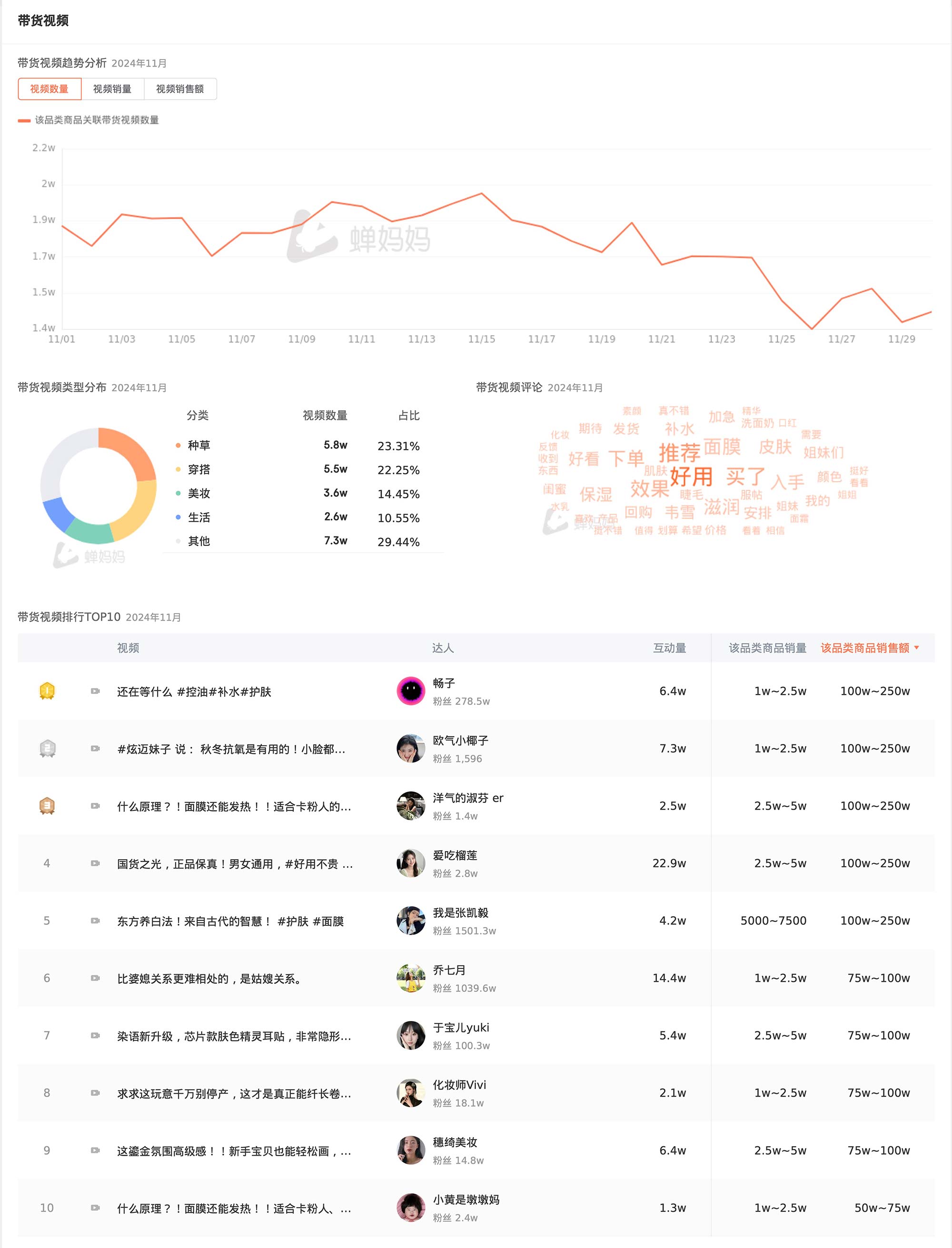 带货直播和带货视频的分析,进一步证实了内容营销在电商领域的重要性。带货直播趋势和带货视频趋势的分析显示,直播已成为美妆护肤品类销售的重要渠道,而视频内容的创意和质量对销售有着直接的影响。