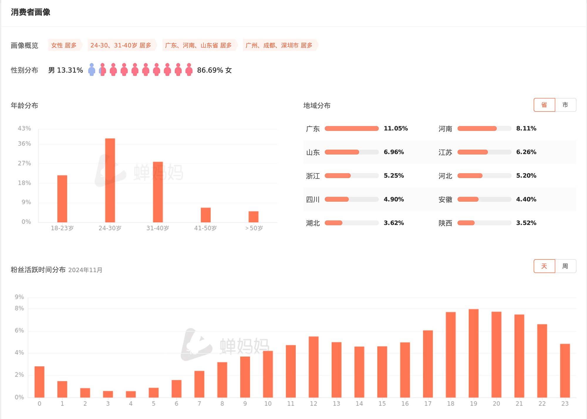 最后,消费者画像的分析为我们提供了性别、年龄、地域分布等关键信息。女性消费者占据绝大多数,年龄主要集中在24-40岁之间,地域分布上,广东、河南、山东等省份的消费者最多。这些数据对于品牌制定精准营销策略至关重要。