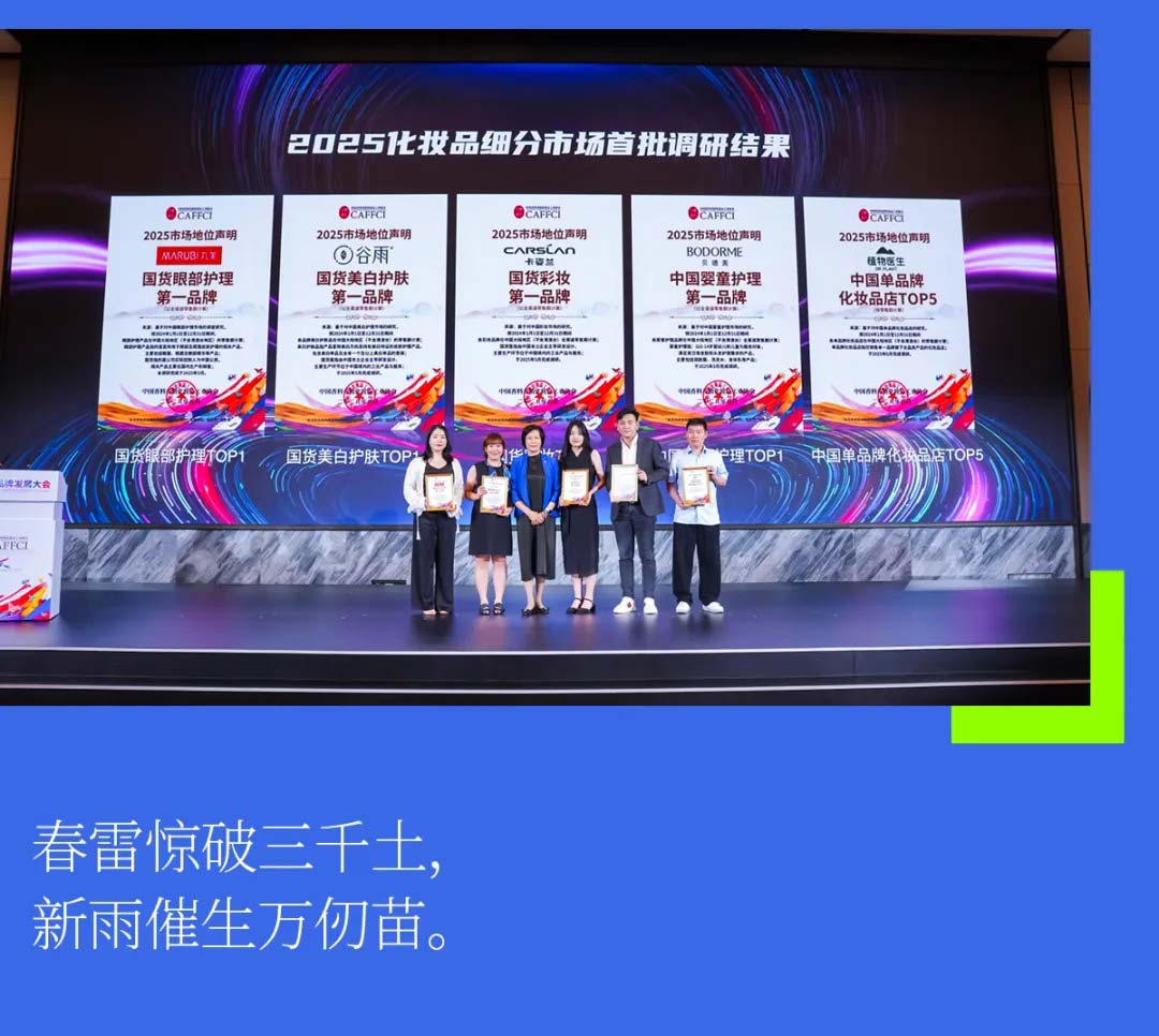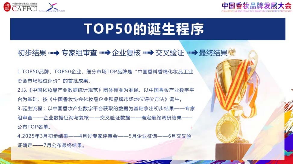 据了解,中国香妆协会于2025年3月拿出了经初步调研后的“2024年度化妆品品牌和企业Top50名单”以及“各细分市场第一名”的名单,于2025年4月组建专家组对初步结果进行审查。从5月份开始对进入名单的企业进行数据征询,对调研结果进行多方交叉验证,并在7月1日的“中国香妆品牌发展大会”上公布了最终调研结果,形成了“2024年度化妆品品牌Top50”“2024年度化妆品企业Top50”两大核心榜单。并为自然堂、丸美、卡姿兰、谷雨、贝德美、植物医生等多个品牌颁发了市场地位声明。