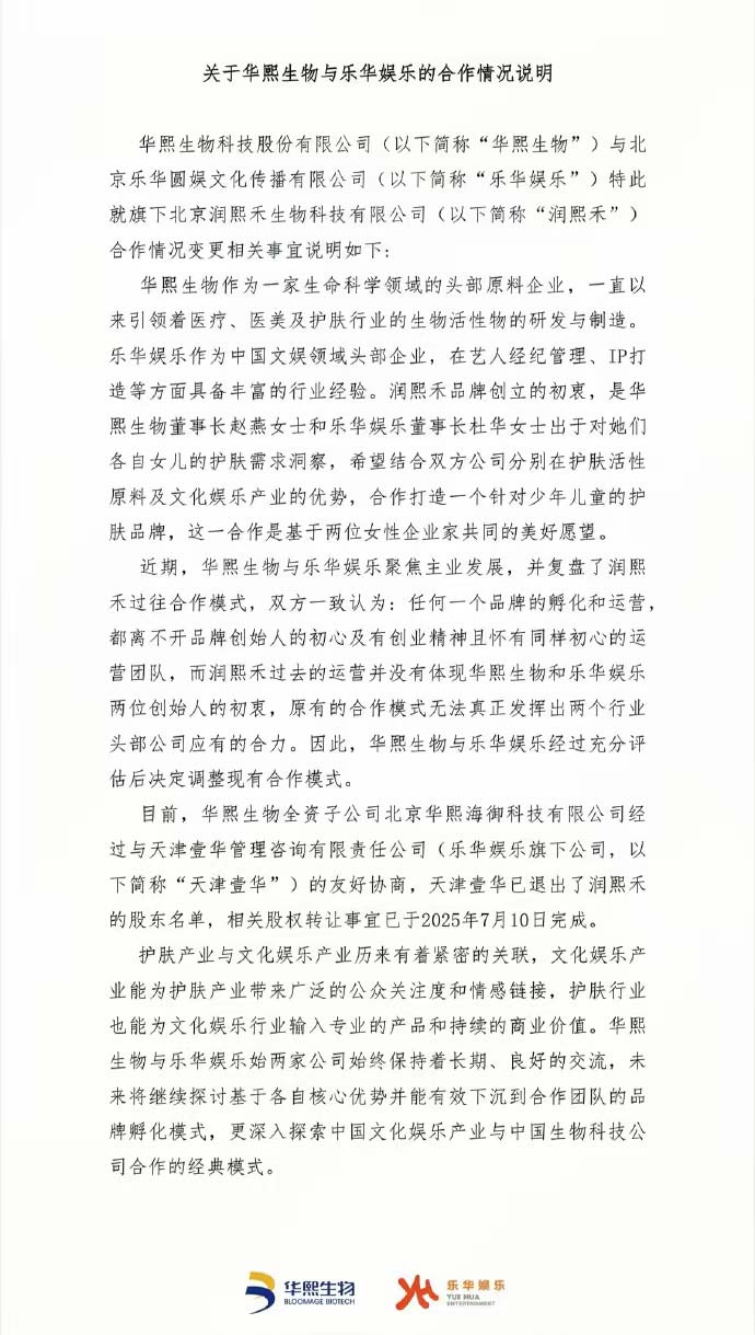 目前,华熙生物全资子公司北京华熙海御科技有限公司经过与天津壹华管理咨询有限责任公司(乐华娱乐旗下公司,以下简称“天津壹华”)的友好协商,天津壹华已退出了润熙禾的股东名单,相关股权转让事宜已于2025年7月10日完成。