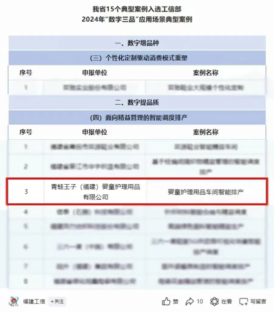 近日,中国工业和信息化部消费品工业司公布了2024年首批“数字三品”应用场景典型案例公示名单,青蛙王子集团报送的“婴童护理用品车间智能排产”案例成功入选。