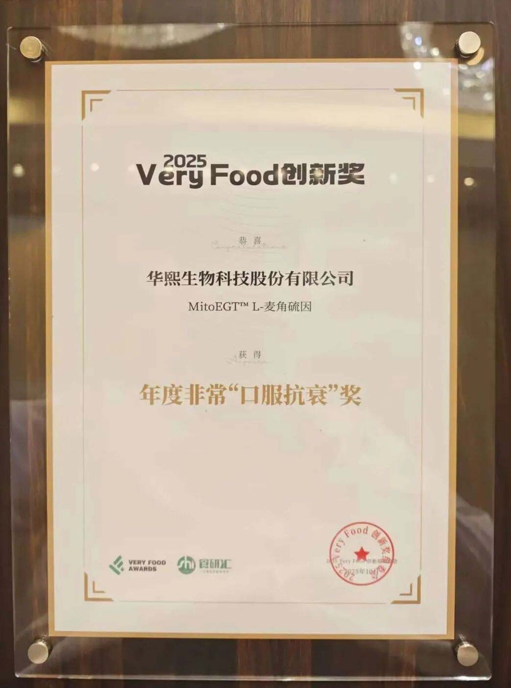 在这场备受瞩目的行业盛会中,华熙生物MitoEGT™ L-麦角硫因凭借卓越的抗氧性能、清晰的线粒体抗衰机制与扎实的科学背书,在众多创新原料中脱颖而出,荣获2025 Very Food创新奖—年度非常“口服抗衰”奖。