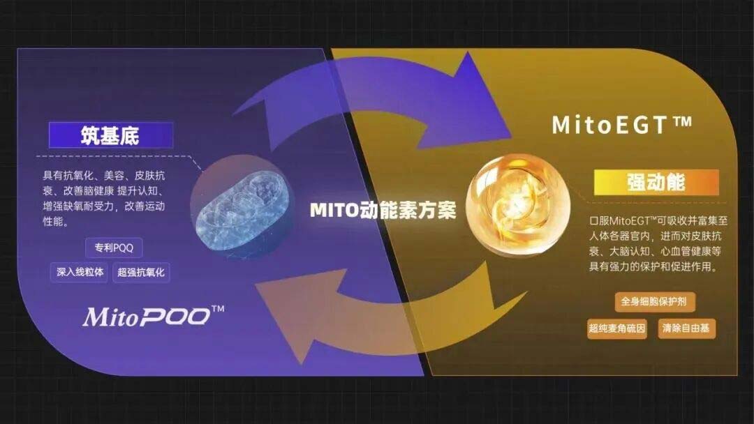 基于MitoEGT™ 靶向抗衰的强大功效,华熙生物结合另一细胞级抗衰成分 MitoPQQ™,推出“基底激活 + 动能激活”细胞级进阶抗衰方案“Mito计划”。