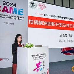 与此同时,九橙实业邀请上海应用技术大学香料香精化妆品省部共建协同创新中心张会芳博士,在会议期间展开专场讲座——《柑橘精油创新开发及在日化产品中的应用》,张慧芳博士就柑橘精油在日化产品中的创新性应用,向众人进行了全方位、深入细致的介绍。从生产环节到实际应用,从纯粹的精油到面霜等护肤品领域,皆进行了多角度、深层次的详尽阐释。