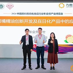 在 2024 年中国香料香精化妆品行业年会暨产业博览会的舞台上,九橙实业再度绽放光彩。这场于 10 月 19 日在南京国际博览中心圆满落幕的盛会,见证了九橙实业与各位香化行业的同仁的不懈追求与卓越贡献。