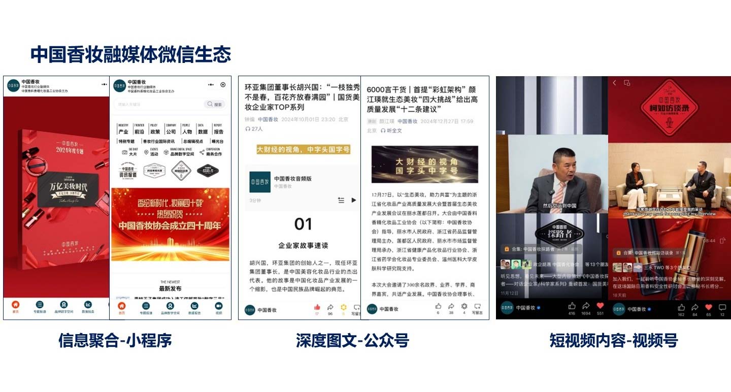 中国香妆融媒体自2024年4月开始筹备,5月20日正式上线中国香妆融媒体小程序,之后陆续上线了公众号和视频号,构建了中国香妆融媒体1.0版媒体矩阵,包括行业信息聚合平台小程序和公众号、视频号,利用文、图、音、像等多种形式,讲好中国香妆好故事,传播中国香妆主旋律,为2025年从1.0版升级到2.0版打下了坚实的基础。
