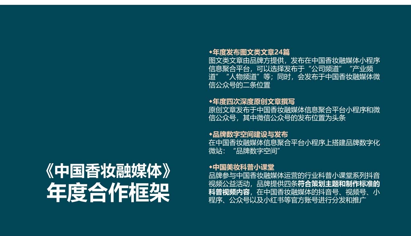 中国香妆融媒体不仅会继续在信息内容和产品服务上发力,深耕“品牌数字空间”等栏目,赋能企业传播,助力行业高质量发展,并还重点打造一系列IP内容与传播产品,包括但不限于创行业之先的“科技美妆星球”、“中国香妆之夜”等。并且,在2025年,中国香妆融媒体执行总编辑会亲自牵头并捉刀“中国美妆头部企业案例研究”与行业简史等工作,特别欢迎行业优秀企业一起参加共创,一起合作共赢。